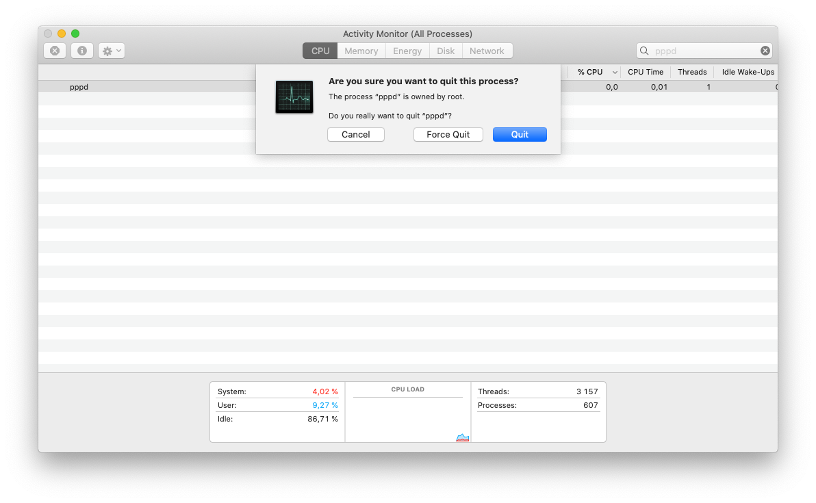 To kill it open Activity monitor and look up pppd process. Then just quit it.